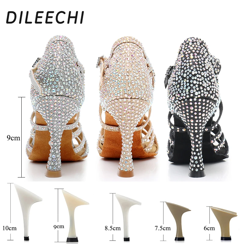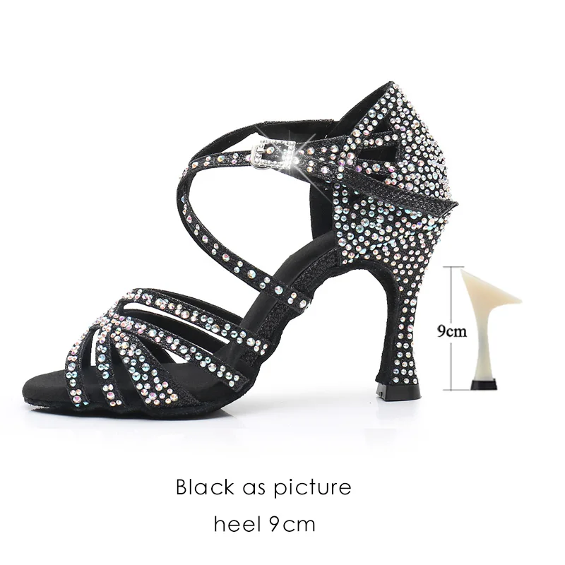 Illuminez la piste avec ces chaussures de danse latine ornées de paillettes or et noir. Le talon cubain de 9 cm apporte une touche de glamour à vos soirées salsa et mariages.
