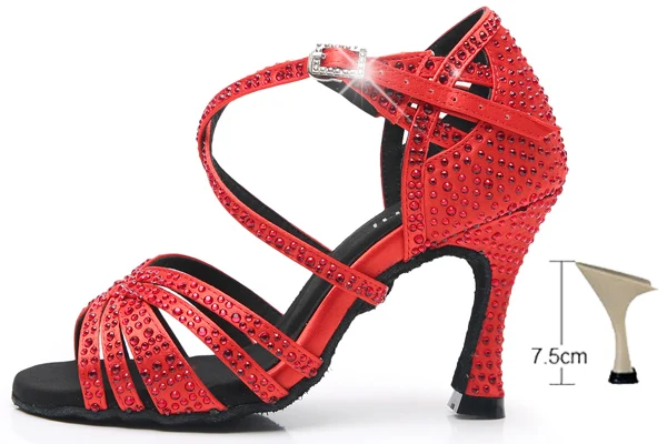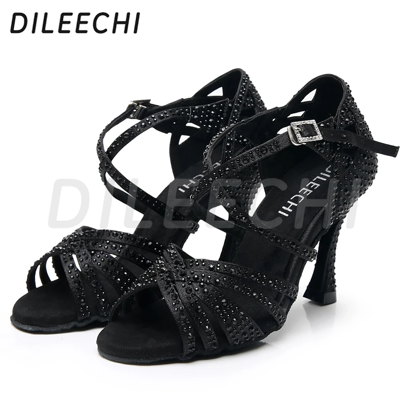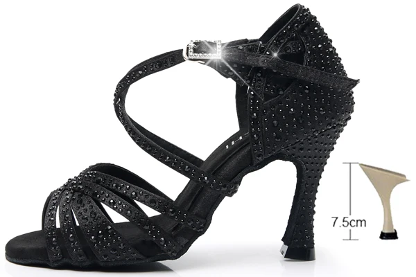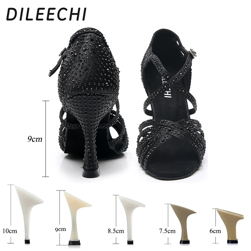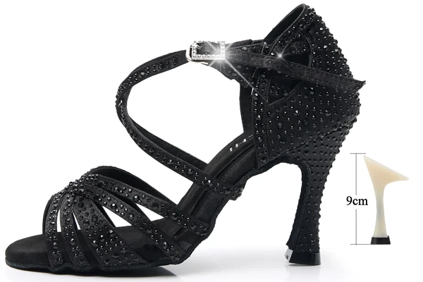 Ces sandales en satin noir ou bleu, brillantes de rhinestones, promettent des soirées inoubliables avec un talon de 9cm, parfaites pour la salsa.