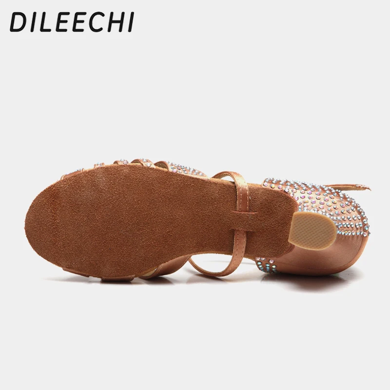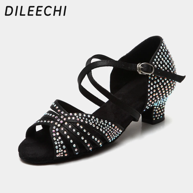 Évoquez l’élégance classique avec ces sandales en satin dark tan ou noir, agrémentées de diamants et dotées d’un talon bas de 45mm, idéales pour les jeunes danseuses de latin.