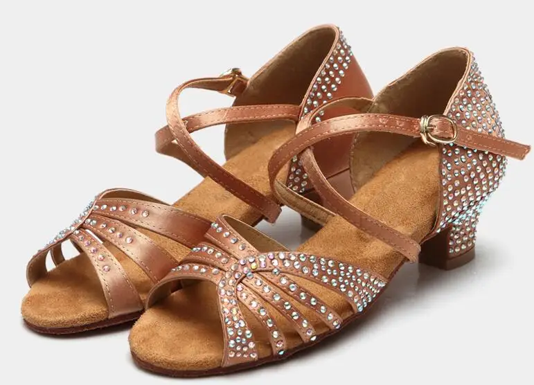 Satin dark tan/noir, diamants, talon de 45mm, pour jeunes danseuses de latin.
