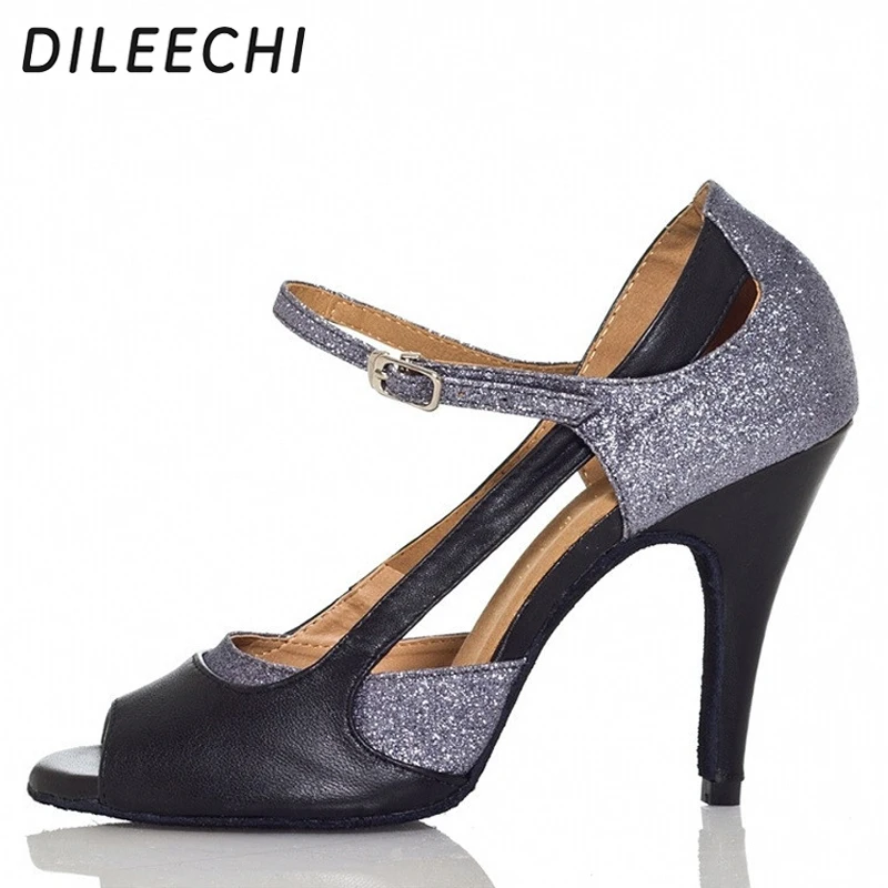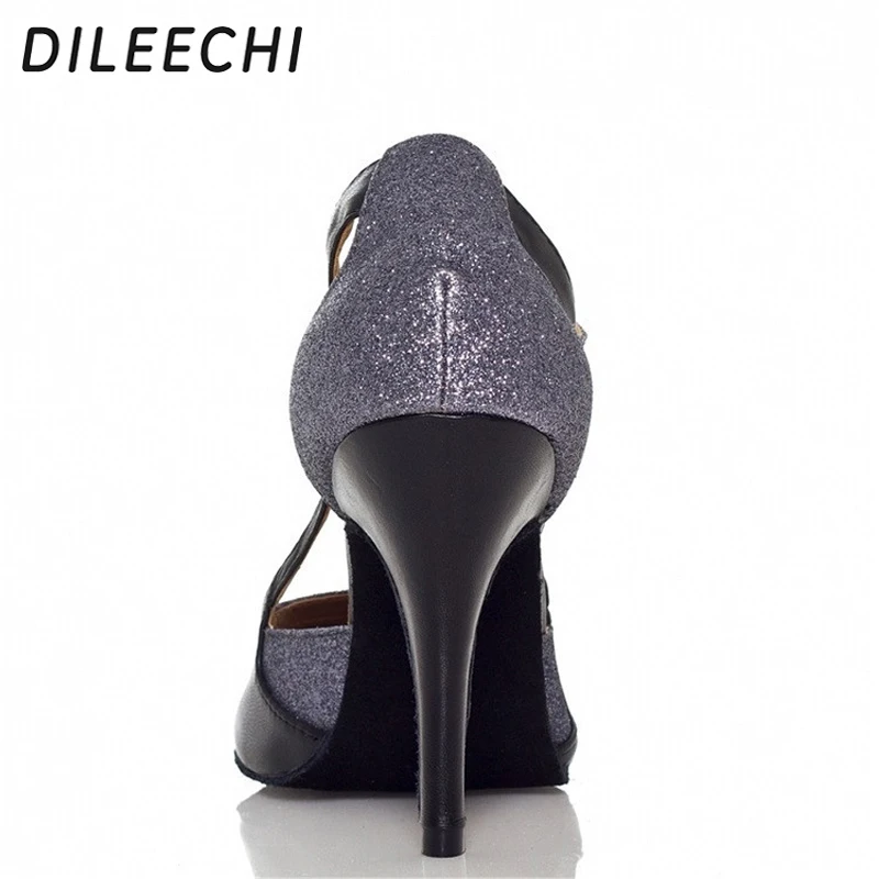Cuir noir/gris, sequins, talon de 10cm, pour danseuses de ballroom.
