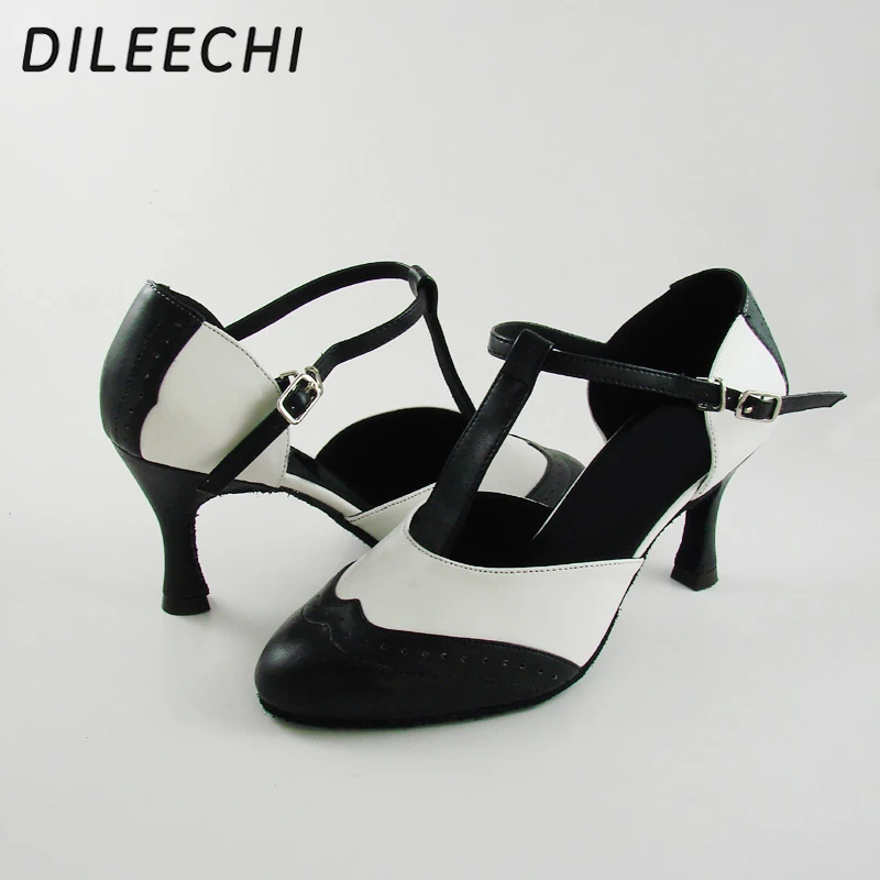 Ces chaussures T-Strap en cuir véritable blanc ou noir pour femme, avec des talons de 7.5cm, sont conçues pour ajouter une touche d’élégance à vos performances de danse moderne ou de salon.