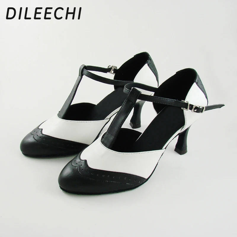 Cuir véritable blanc/noir, T-Strap, talons de 7.5cm, pour danse moderne et de salon.